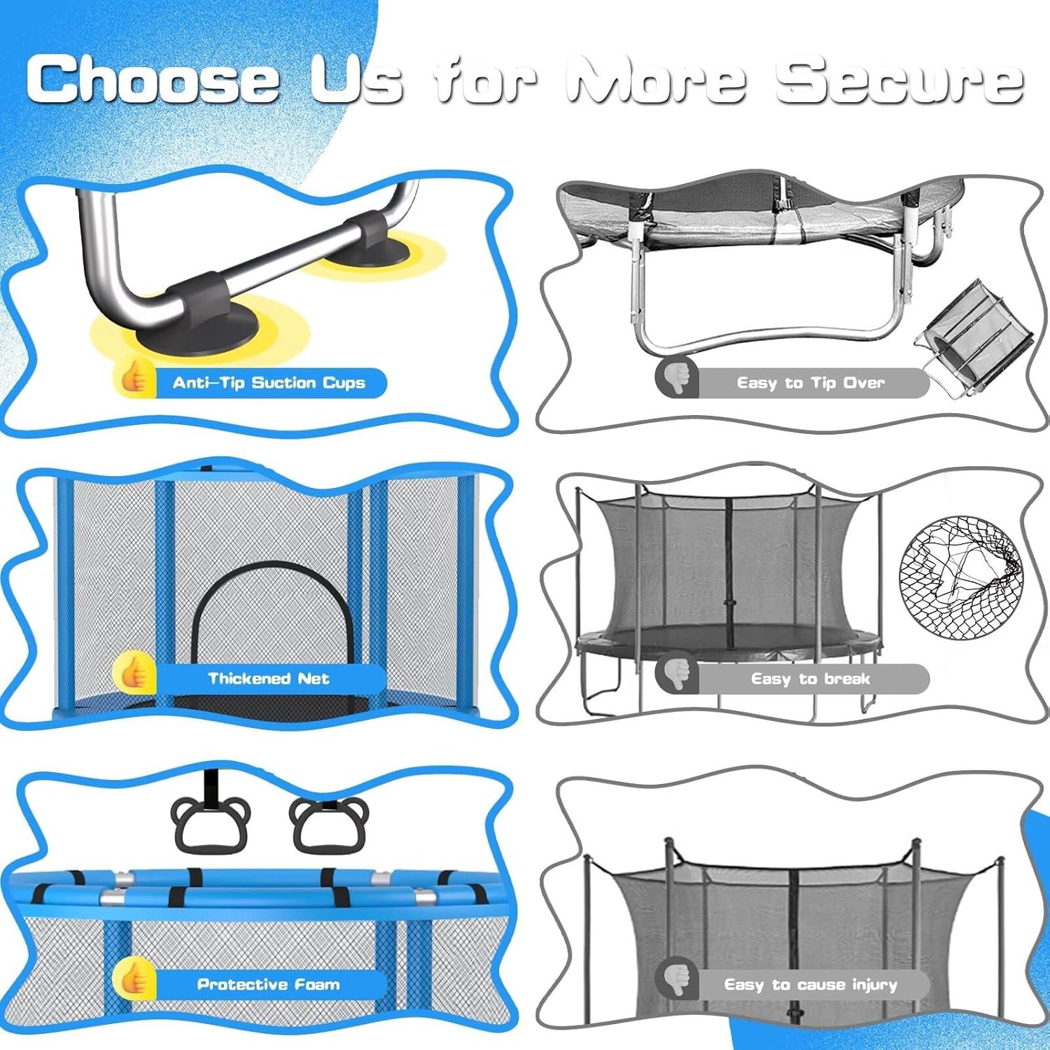 Includes Trampoline, Safety Net, Gymnastics Bar, Non-Slip Ladder, Toys